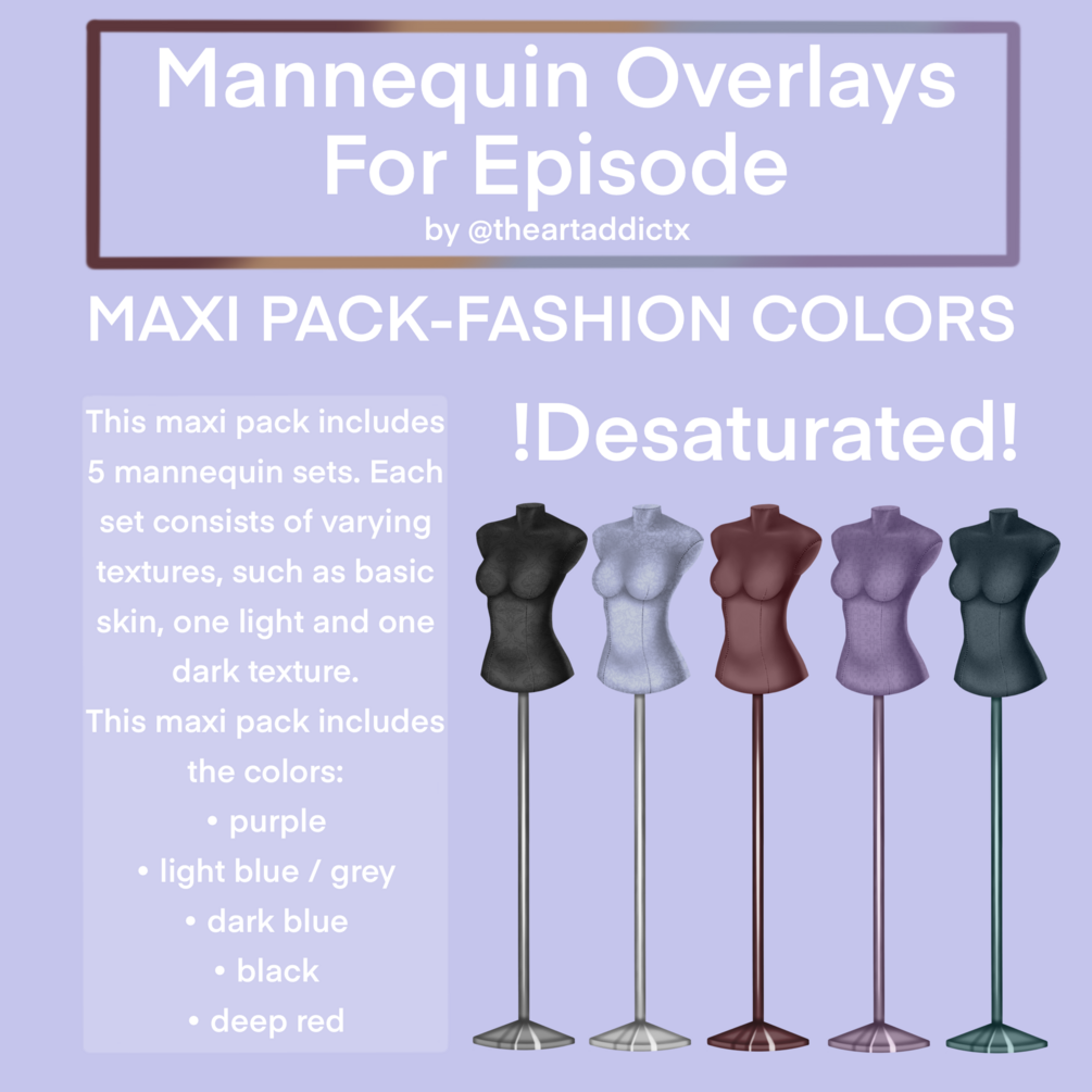 In this maxi pack you will get 5 sets of desaturated fashion color mannequins with 4 different textures per set.